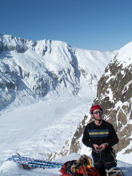 This is a small couloir faintly visible up above the Mer de Glace between the Chapoura refuge and the Aiguille Verte. It can be accessed by a fairly easy skin up the back side and then a short 30m climb to the top, but that would miss out on checking out the conditions on the way up, so we climbed up it as well. There was a spot of ice climbing at the bottom.